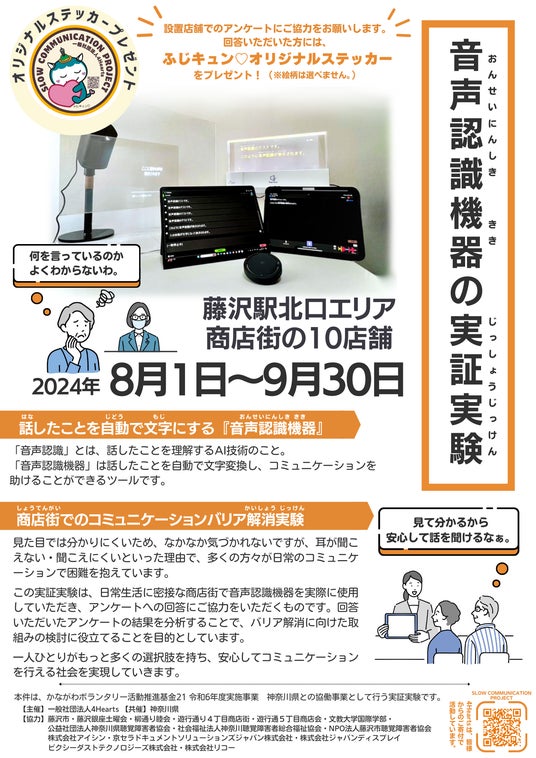 一般社団法人4Heartsは、神奈川県と藤沢市の協力のもと、かながわボランタリー活動推進基金21を活用し、令和6年8月1日から9月30日まで、藤沢駅北口の商店街で音声認識機器の広域実証実験を行います。4Heartsの代表は聴覚障害当事者であり、当事者目線での連携を行っています。この実証は、聴覚障害者や外国人、高齢者を含むすべての市民が直面するコミュニケーションの障壁を理解し、解消することを目的としており、地域社会に新たな合理的配慮のモデルを提案します。