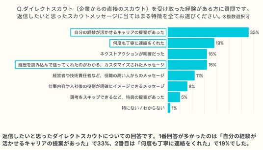4. 約2割が「何度も丁寧に連絡をくれた」ためにダイレクトスカウトに返信スカウトメッセージについて、経歴を読み込んだ上でカスタマイズされたメッセージを送ることが理想です。一般的なメッセージではなく、候補者のスキルや経験に基づいた具体的な内容を含めると、候補者は自分が評価されていると感じやすくなります。また返事がなくても諦めずに丁寧な連絡をすることも効果があることがわかります。