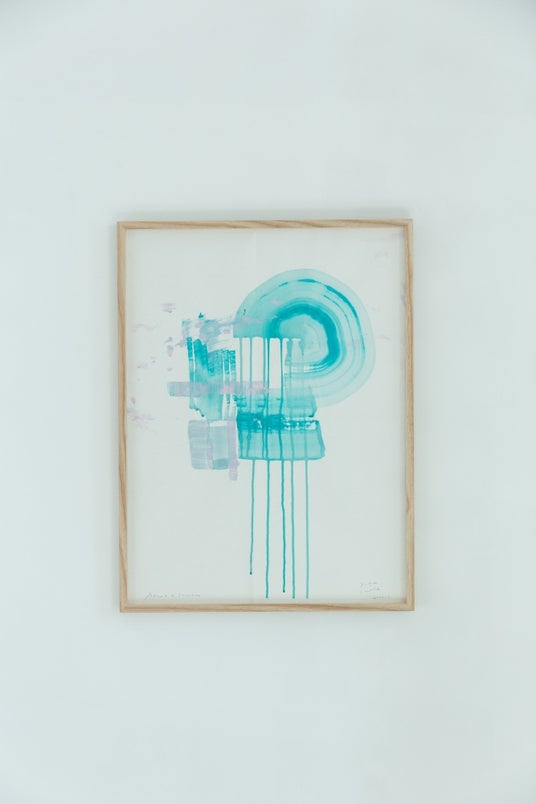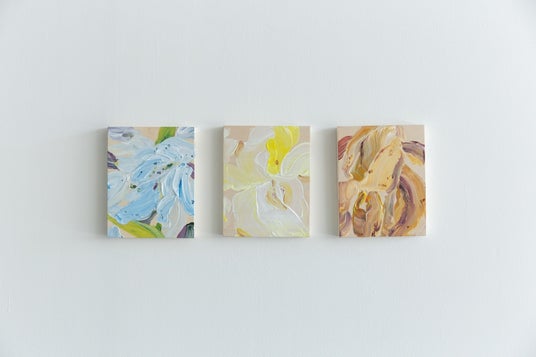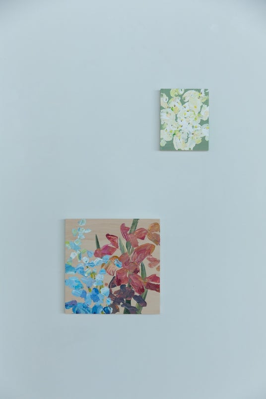 岩瀬ゆかさんの作品は、うつろう光や風、音、香りといった多様な要素に触れた瞬間の、はっとするような感覚を落とし込んだ絵画の原画作品が並びます。