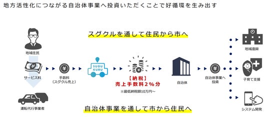 今回の新しい取り組みでは、このプラットフォーム利用料の10%のうち2%を企業版ふるさと納税として該当地域の自治体に還元する形をとります。この仕組みにより、地域の発展に必要な資金が生み出され、自治体が行う地域振興プロジェクトや子育て支援、システム開発などに投資されることが期待されます。結果的に、地域住民が支払った利用料の一部がスグクルと自治体を通して地域住民へ還元される仕組みづくりを目指しています。