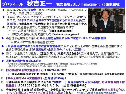 株式会社VUILD management(神奈川県川崎市、代表取締役秋吉正一)は、中小企業等経営強化法に基づき経済産業大臣から認定された「事業分野別経営力向上推進機関」(全国で9機関のみ)であり、中小企業に精通した支援機関として「中小企業の本気の賃上げ」実現の為に活動を展開しています。