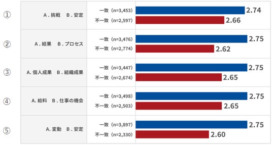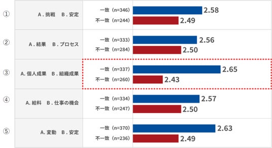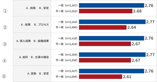 図表2では、以下の1.~5.に対し、「どちらを重視してほしいか」「実際にどちらが重視されているか」について本人が回答し、回答が一致していれば“一致群”、一致していなければ“不一致群”としています。