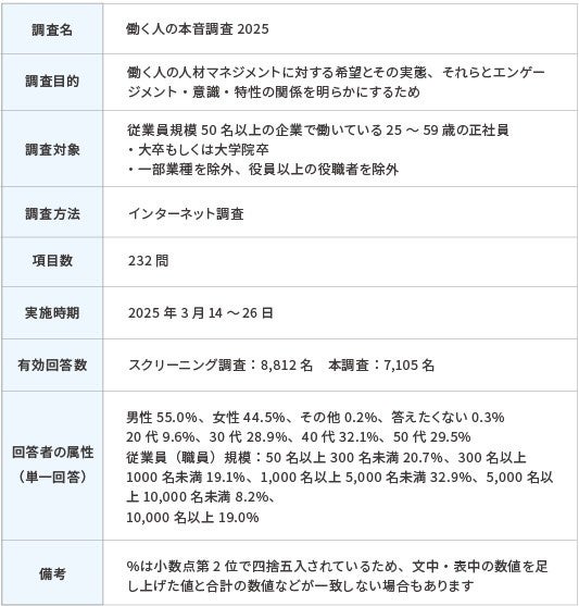 会社における経営・人事課題の解決および、事業・戦略の推進を支援する株式会社リクルートマネジメントソリューションズ(本社:東京都港区 代表取締役社長:山崎 淳 以下、当社)は、昨年度に続き、今年度も従業員規模が50名以上の企業に勤める25歳~59歳の正社員7,105名に対して、『働く人の本音調査2025』を実施しました。第1弾となる今回は、働く人たちがマネジメントについてどのような希望をもち、マネジメントの実態をどのように捉えているかと、「年収への満足度」との関係性にまつわる分析結果を公開しました。