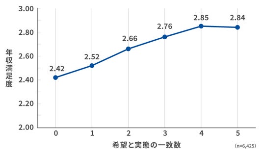 (図表5:30~50代で、本人の希望と会社の実態の一致数と年収満足度のスコアの関係性)