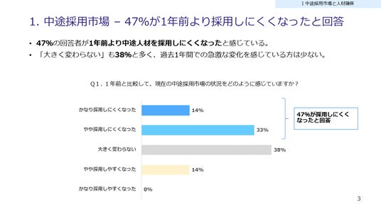 - 約半数が1年前より採用しにくくなったと回答