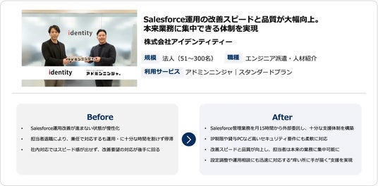 アドミンニンジャ導入事例:株式会社アイデンティティー様では、担当者退職や兼務による運用停滞を解消し、Salesforce改善のスピードと品質を大幅に向上。本来業務へ集中できる体制を実現。