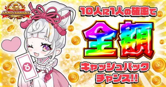 10人に1人、対象期間内に消費した「有料コイン」を全額ボーナスコインとしてキャッシュバックするキャンペーンを実施します。
