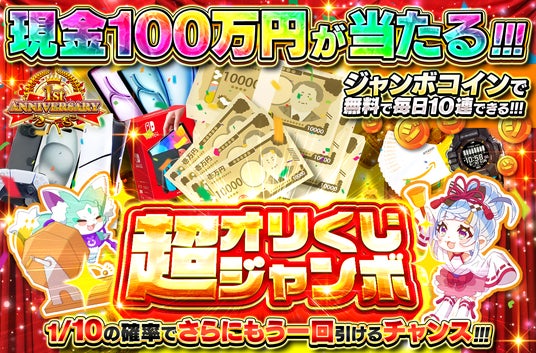 『オリくじ』1周年を記念して、「超オリくじジャンボ」を開催します。超オリくじジャンボは、『オリくじ』にログインすることで獲得できる「ジャンボコイン」を使って引ける特別なガチャです。『超オリくじジャンボ』は期間中毎日無料で10連引くことができます。