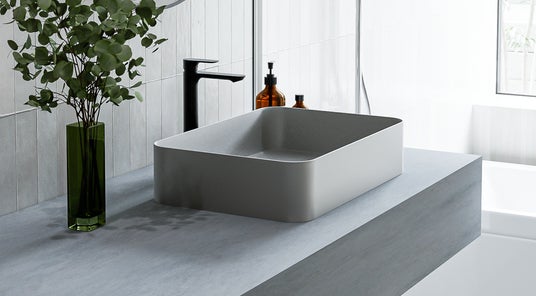 見付けを極限まで薄くしたノイズレスなエッジに、柔らかい曲線を加えることで温かみのある空間を演出します。石目調の底板を併用することで天板と一体化し、排水口の見えないすっきりとした空間を実現。金属の質感を活かしたマット塗装仕上げは、洗面空間はもちろん手洗いニーズの増えたパブリック空間にも調和するプロダクトです。