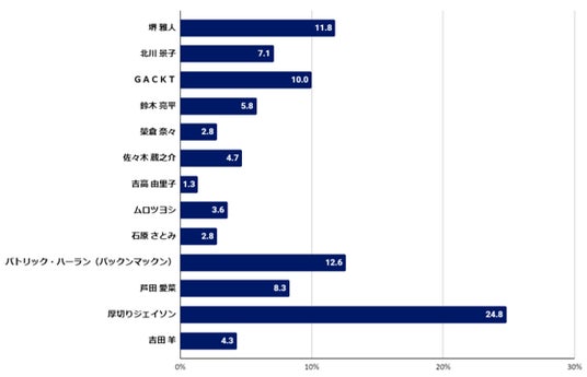 「人生のマネープランが上手そうなイメージがある有名人」を調査したところ、第1位は資産形成に関する著作が多い「厚切りジェイソン」さん(24.8%)でした。2位は同じく資産形成に関する著作が多い「パトリック・ハーラン(パックンマックン)」さん(12.6%)、3位はドラマで銀行員役を演じた堺雅人さん(11.8%)、4位は「GACKT」さん(10%)、5位は「芦田愛菜」さん(8.3%)でした。