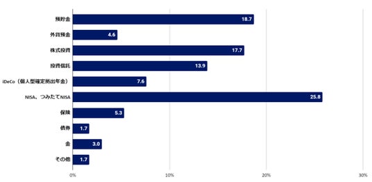 資産形成を「すでに行っている」「すごく関心がある」「少し関心がある」方に、関心がある資産形成について調査したところ、トップが「NISA・つみたてNISA」(25.8%)、次いで「預貯金」(18.7%)、株式投資(17.7%)でした。
