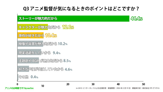 最も多い回答が「ストーリー」で44.4%、次点で「キャラクター」が12.1%となりました。