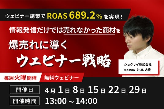 ショクサイ株式会社(代表取締役:辻本 大樹)は4月1日(火)13時よりBtoBマーケティング担当者向けに「ウェビナー施策でROAS 689.2%を実現!情報発信だけでは売れなかった商材を爆売れに導くウェビナー戦略」を開催いたします。