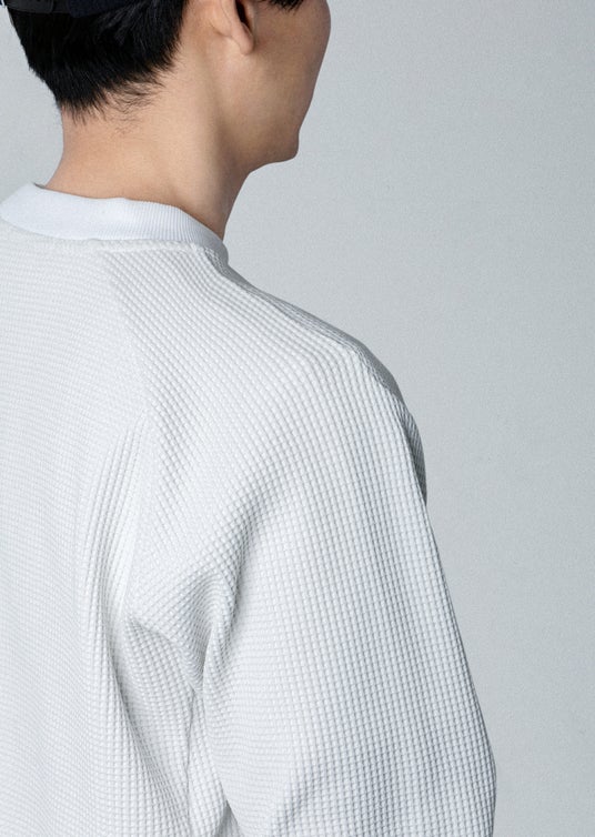 ワッフル特有の凹凸が生地と身体の間に空気の層を作り、適切な温度調整と優れた通気性、UVプロテクト(UPF50+)機能もあり1年中快適に使うことができます。