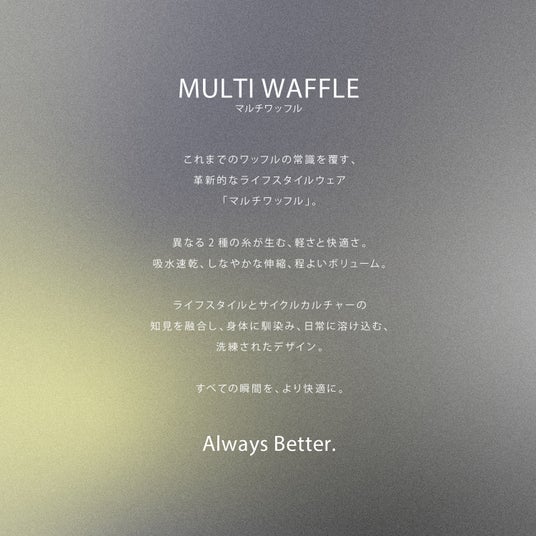 MULTI WAFFLE は、Season Less, Scene Less, Style Less & Gender をコンセプトに、2020年に登場したクルーネック ロングスリーブから続くベストセラーシリーズです。これまでの重く・乾きにくいと言ったサーマルの常識を覆し、ファンクションとファッションが融合したプロダクトとして愛されてきました。