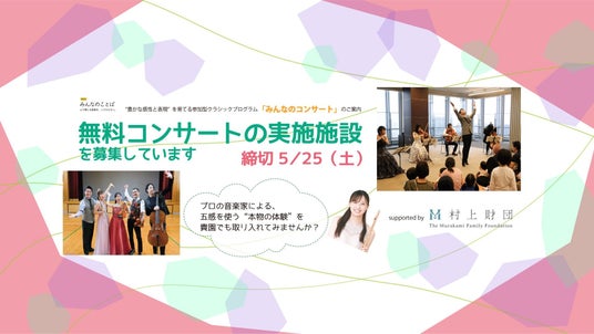 音楽で子どもの心を育てる特定非営利活動法人みんなのことば(所在地:東京都新宿区、代表:渡邊悠子、以下:NPO法人みんなのことば)は、家庭環境や教育環境に関わらず、ひとりでも多くの子どもたちに五感を使い心を育てる“本物の体験”の機会を届けることを目的とし、2024年度に引き続き、一般財団法人村上財団の支援により、無料コンサートを開催したい施設の募集を開始しました。