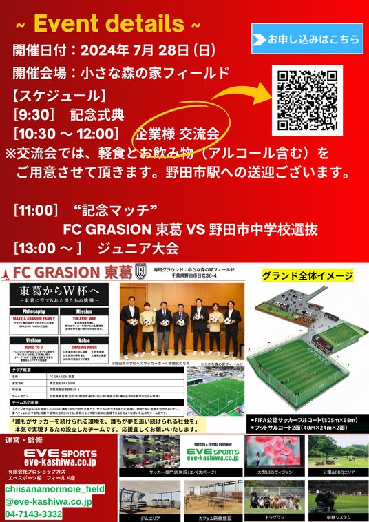 FC GRASION 東葛のホームグラウンドである小さな森の家フィールド(千葉県野田市目吹36-4)のグランドOPENイベントを、2024年7月28日(日)に開催いたします。