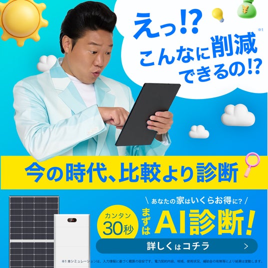 無料診断サイトから6つの質問に答えるだけで、最短30秒で現在の電気代に基づいた導入効果をスピーディーに算出できます。月々の電気代が分かる「検針表」や、平米数が分かる「家の図面」をご準備いただくと、スムーズにシミュレーションができます。