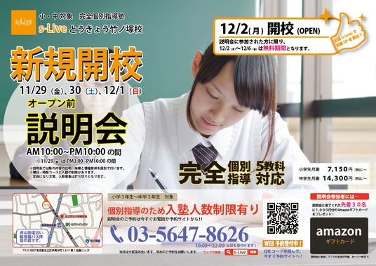 個別指導塾s-Liveは12月2日、東京都足立区伊興本町にオープン。11月29日~12月1日の3日間で開校前説明会を開催する。