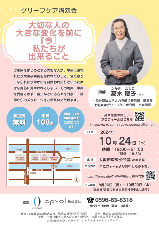 opsol 株式会社(所在地:三重県伊勢市/代表取締役社⾧:鈴木征浩)は、グリーフケア(悲嘆のケア)の第一人者である高木慶子(たかきよしこ)先生を講師に迎え、『大切な人の大きな変化を前に「今」私たちが出来ること』をテーマに、参加費無料、事前申込制にて、2024 年10 月24 日(木)19 時から、大阪市北区の大阪市中央公会堂にて、グリーフケア講演会を開催します。