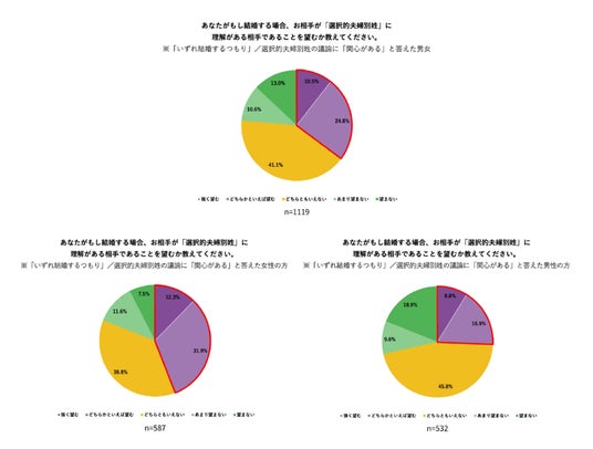 - 女性では44.2%、男性でも25.7%が「結婚相手に選択的夫婦別姓への理解を望む」と回答
