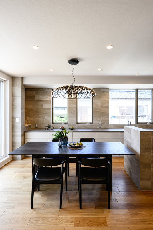 シンプルでモダンなデザインはアイネスト様が手掛けられたダイニングの落ち着いたトーンと調和しており、全体のインテリアを引き締めてくれています。