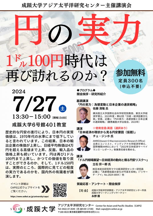 成蹊大学(東京都武蔵野市、学長:森 雄一)は、2024年7月27日(土)に成蹊大学アジア太平洋研究センター主催講演会「円の実力:1ドル100円時代は再び訪れるのか?」を開催する。歴史的な円安の進行により、日本円の実質価値は、1970年代の水準にまで低下していると言われている。この結果、日本の輸出企業の株価が上昇し、日経平均株価は4万円を超える高値まで上昇、反面、輸入品の価格上昇も続いている。円は再び1ドル100円まで上昇し、かつての価値を取り戻すことができるのか、そして、1ドル150円は、実際のところ、国際的に見てどの程度の実力であるのかを、国内外の有識者が講演する。