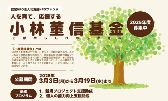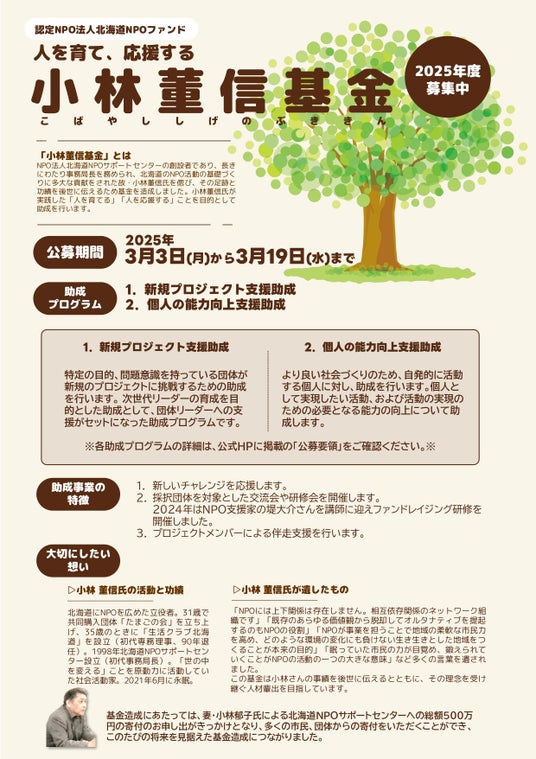認定NPO法人北海道NPOファンドでは、NPO法人北海道NPOサポートセンターの事務局を長きにわたり務められ、北海道のNPO活動の基礎づくりに多大な貢献をされた故・小林董信氏を偲び、その足跡と功績を後世に伝えるために基金を造成し、小林董信氏が実践されていた「人を育てる」「人を応援する」ことを目的とした助成を行います。今年度で3度目の公募となります。