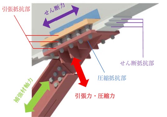 アドジョイント工法の力の伝達機構は図2に示すとおりで、せん断抵抗部・引張抵抗部・圧縮抵抗部に分かれています。