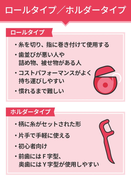 デンタルフロスには形状がホルダータイプとロールタイプの2種類。それに付随してワックスの有無が合わさって計4種類になります。それぞれの特徴を紹介します。