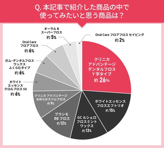 回答者にGranza Beautyの記事『デンタルフロスにおすすめの10品をオーラルケアアドバイザーが実際に試してランキング|種類や選び方を解説』にある商品の中でどの商品を使ってみたいかを聞いてみました。ここでは『使ってみたいデンタルフロスのTOP5』を紹介します。