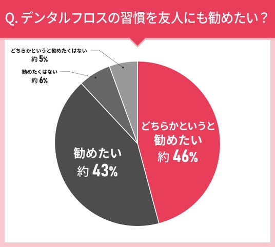 最も多いのが歯磨き後。ついで歯磨き前と回答者たちは自分なりのルールでデンタルフロスを使っているようです。では、デンタルフロスの習慣を友人に勧めたいかを聞いてみました。