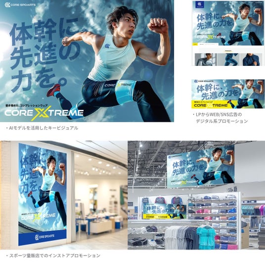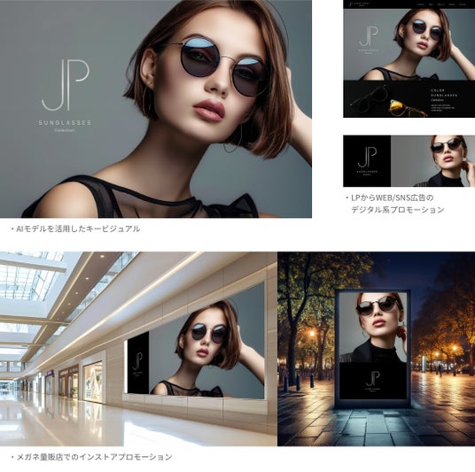 AIモデルを活用することで、WebやSNSのデジタル広告から店頭ディスプレイ、印刷物まで、統一感のあるビジュアルでブランドイメージを一貫して展開できます。従来、WEB/SNS広告やECサイトでのモデル着用画像等に限定されていたAIモデルの活用が、デジタル領域からリアルな紙媒体・店舗ディスプレイまで、ワンストップで制作が可能となりました。