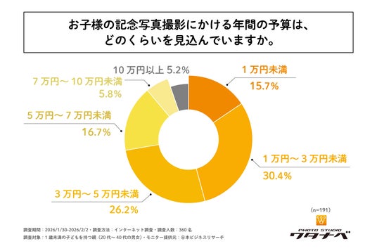 子どもの1歳以降の記念写真撮影について、複数年にわたる計画がある親の4人に1人以上が、子どもの記念写真撮影にかける年間予算として「5万円以上」を見込んでいる