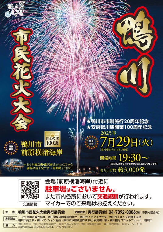 本花火大会は、地域の協力と支援に支えられ、長年にわたり親しまれてきました。今年は、鴨川市市制施行20周年、ならびにJR安房鴨川駅開業100周年という節目の年を迎える特別な夏となります。鴨川ならではのイベントに、ぜひご家族やご友人とともにご来場いただき、思い出深いひとときをお過ごしください。