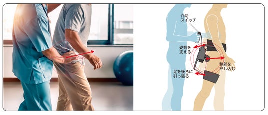 片まひ患者を中心とした歩行リハビリテーション用ロボティック装具。これまで理学療法士が徒手により支えていた股関節伸展の介助をモーターとワイヤーの力でアシストします。これまでのアシストスーツのような「力のアシスト」だけでなく、inoGear HE-1では理学療法士の正しい歩行姿勢に導く「技のアシスト」も実現します。