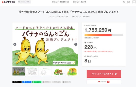 さまざまな理由で「規格外」となり、廃棄されてしまう=フードロスとなっているバランゴンバナナを有効活用していく「ぽこぽこバナナプロジェクト」。今年の大きな活動として、フードロスの存在を小さな子どもにも楽しく伝える絵本『バナナのらんとごん』の制作を進めており、出版費用の資金調達のクラファンを実施しています。