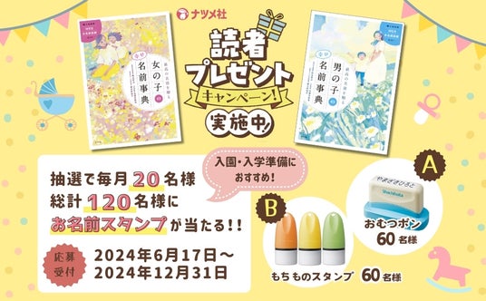 暮らしや人生に役立つ実用書を発行している出版社、株式会社ナツメ社(東京都千代田区、代表取締役:田村正隆)から発売中の『最高の名前を贈る女の子の幸せ名前事典』(https://amzn.asia/d/0cvl6pV0) 『最高の名前を贈る男の子の幸せ名前事典』(https://amzn.asia/d/06b6ZQZ3) では、発売を記念して読者プレゼントキャンペーンを実施しています。