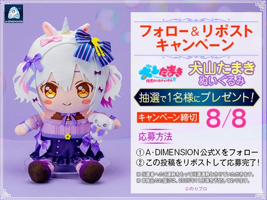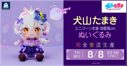 株式会社A・DIMENSION(Aディメンション)(本社:東京都台東区、代表取締役社長:上村篤)は、「のりプロ」の大人気“男の娘VTuber” 犬山たまきさんが、2024年の「犬山たまき生誕祭」で披露した「ユニコーン衣装 地雷風」をぬいぐるみ化した『のりプロ 犬山たまき ユニコーン衣装 地雷風ver. ぬいぐるみ』の発売を決定し、予約受付を2025年6月1日(日)10:00より開始いたします。
