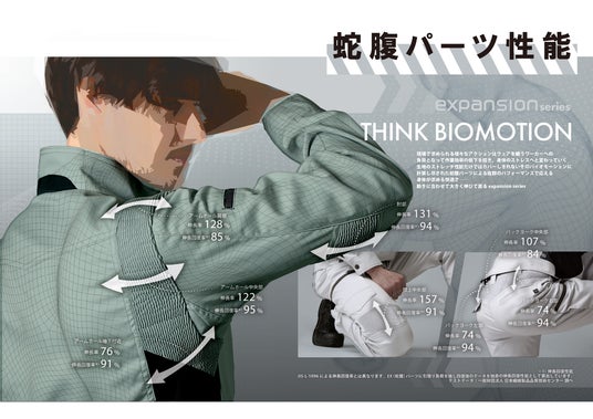 実用性を重視し、大容量ポケットやスマートフォンを収納できるポケット、両袖にはペン差しとファスナー付きポケットなどを追加しました。また、ストレッチ性能に加え、肩・ひじ・膝・腰には伸縮する蛇腹状のパーツが施されており、動きやすく現場での作業効率の向上にも寄与しています。