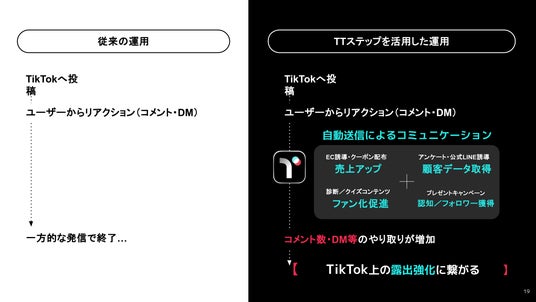 TikTok公式APIが公開されたことをきっかけに弊社では、TikTokをビジネス活用する方々とユーザーがより深いコミュニケーションができるチャットボットツール「TTステップ」を開発し、期間限定完全無料でのサービス提供を7/15日より開始いたします。