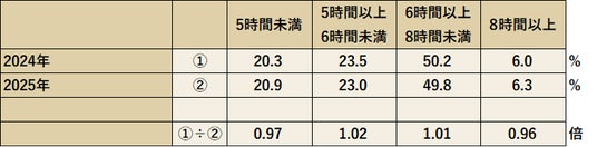 引用:一般社団法人日本リカバリー協会 日本の疲労状況2025ー睡眠時間(全体、2024-25年比較)単位:%