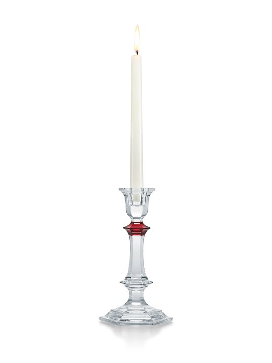 新作のキャンドルスタンドは、重厚感と輝きが際立つフォルム、フラットカットや六角形の美しい台座といった『アルクール』の特徴に加え、ステム部分の装飾に赤いアクセントを施しました。これはバカラというブランドを象徴し、ルイ・フィリップ王のグラスへのオマージュが込められています。
