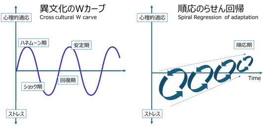 異文化研修では、「異文化のWカーブ」「順応のらせん回帰」などを通じてストレスと心理的適応などを学び、更に異文化を形成する価値観の違いの存在にフォーカスし、価値観の違いこそがチームや組織を大きく飛躍させる事を学びます。