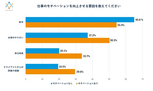 一方で、モチベーションがない人は「給与」を挙げる割合が高い(モチベーションあり:54.4%・モチベーションなし:65.0%)結果となりました。