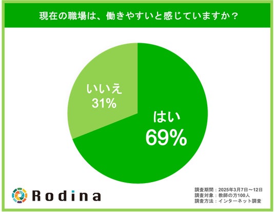 教師の方を対象に、現在の職場は働きやすいかを聞いたところ、69%の方が「はい」と回答し、いいえと回答した方は31%となりました。多くの方が「働きやすい」と回答したなか、その理由について下記の設問で深掘りをおこないました。