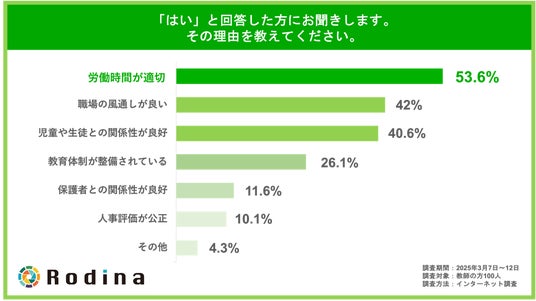 次いで、「職場の風通しが良い(42%)」「児童や生徒との関係性が良好(40.6%)」などの回答も上位となりました。