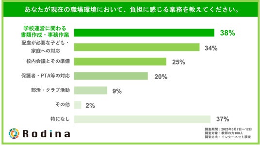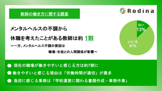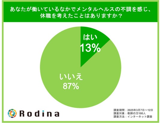 復職・就職を支援し、リワーク事業を展開する株式会社Rodina(本社:広島県広島市、代表取締役:山田 康輔)は、教師の方100名を対象とし、働き方に関する調査を実施いたしました。