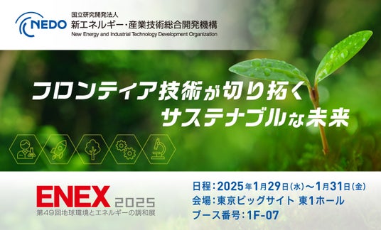 国立研究開発法人新エネルギー・産業技術総合開発機構(以下:NEDO、本部:神奈川県川崎市、理事長 斎藤保)は、1月29日(水)~31日(金)に東京ビッグサイトにて開催されるENEX2025 第49回地球環境とエネルギーの調和展/RE2025第19回再生可能エネルギー世界展示会&フォーラム(以下:ENEX2025・RE2025)に出展します。2050年のカーボンニュートラル社会実現に向けた省エネ・再エネ技術に関するNEDOの取り組みを、隣り合う2つのブースから発信します。