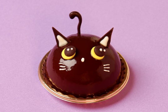 ピンと立った耳としっぽ、クリクリお目めが愛らしい「黒猫」のチョコレートムースケーキ。